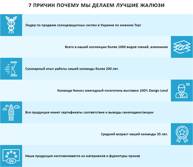 На сайті інтернет-магазину нашої фірми Ви знайдете конструкції на будь-який смак. Тут можна замовити вертикальні, а також горизонтальні жалюзі, виготовлені з дерева, металу, пластику та інших видів матеріалів. До Вашої уваги на сайті представлені жалюзі з бамбука і тканини, ролети системи день-ніч, різноманітні римські штори і т. д., які можна встановити в дитячу, кухню, вітальню або спальню.